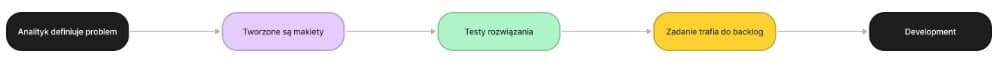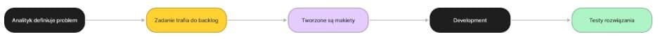 Analyst defines problem -> mock-ups are created -> solution tests -> task goes to backlog -> development.