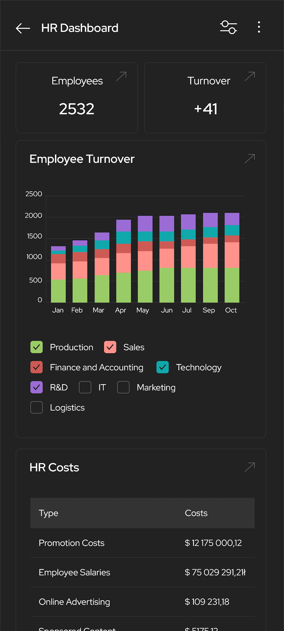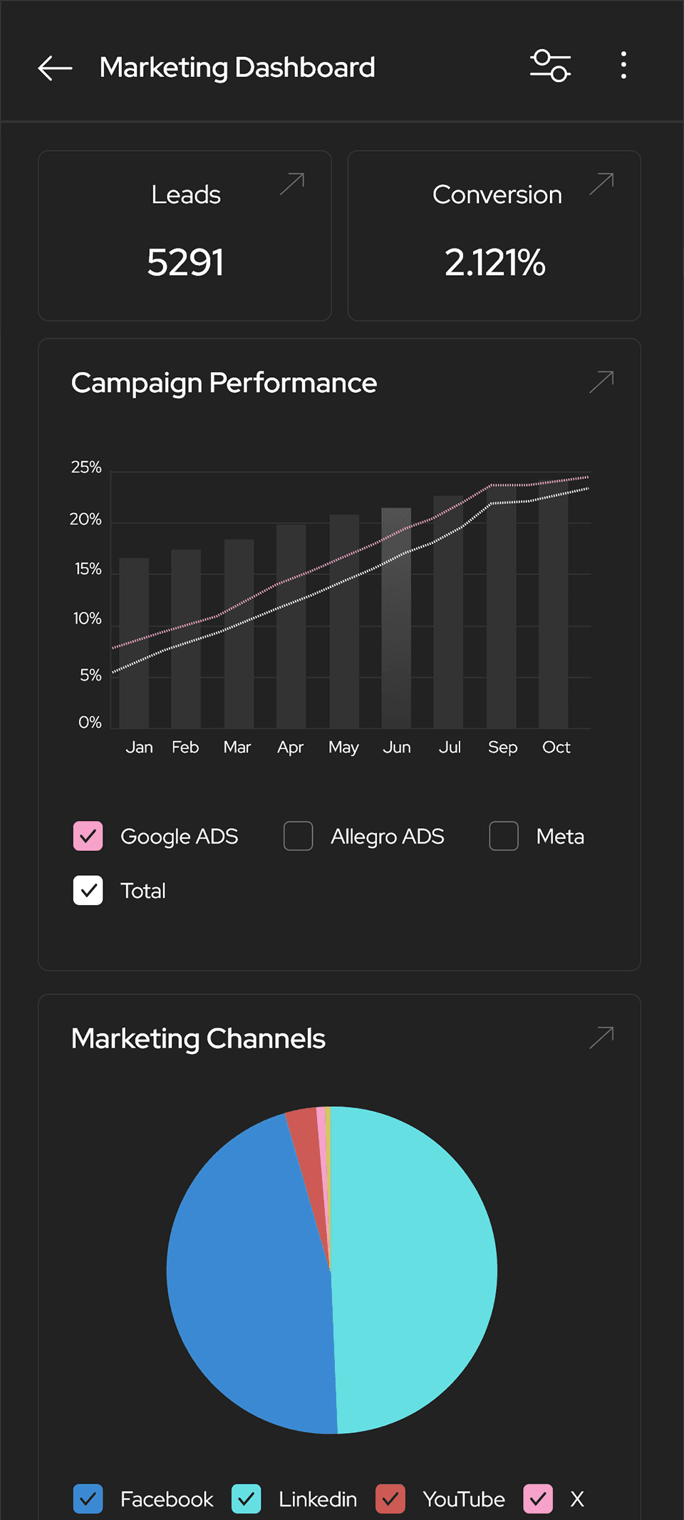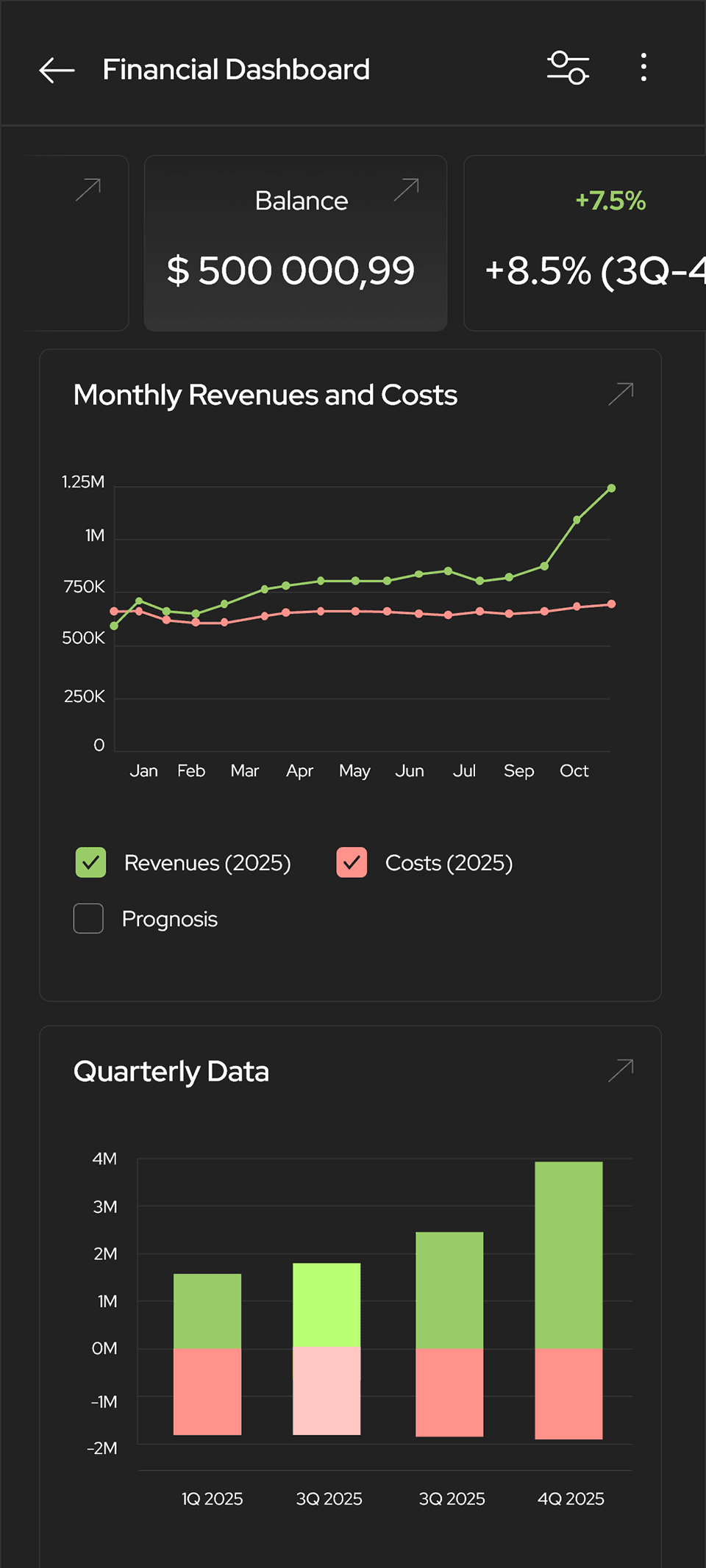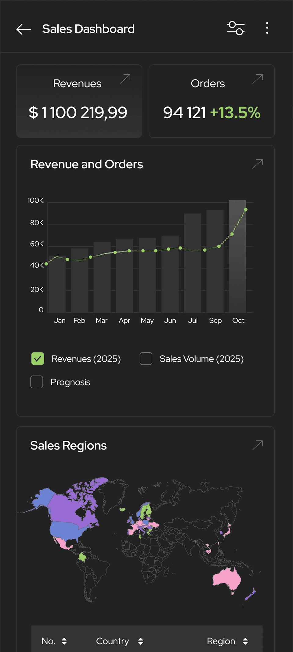 Build interactive reports featuring tables, charts, KPIs, and geographic maps. Utilize ready-made templates or design custom reports tailored to your needs. Present data clearly and engagingly to support decision-making.