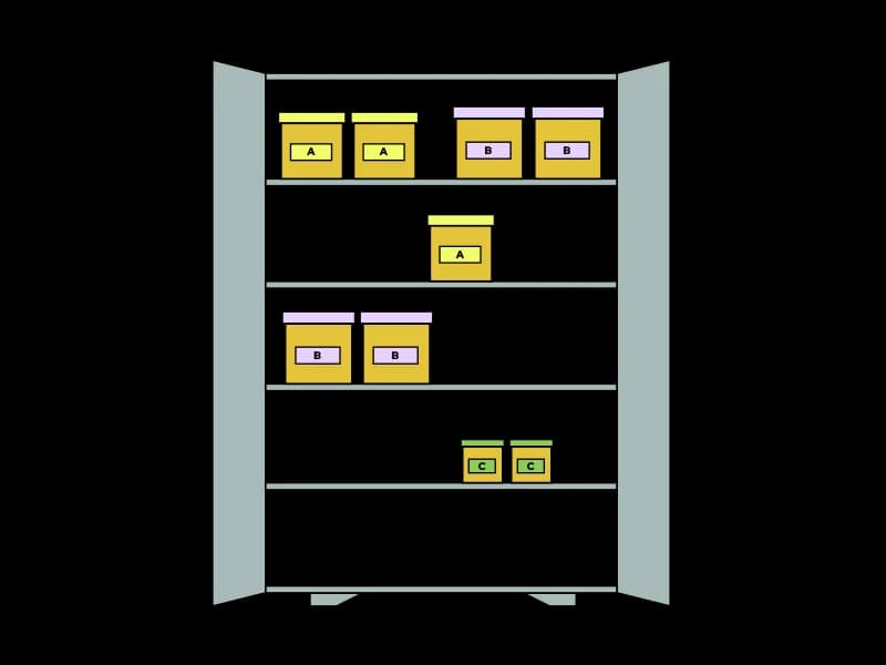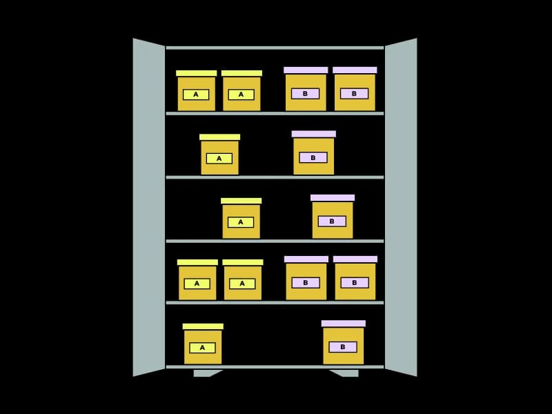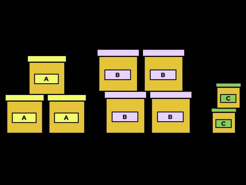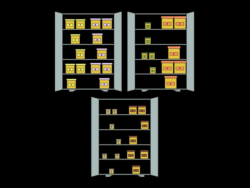 Ale możemy to też bardziej zorganizować. Załóżmy, że chcemy mieć jednak każdy typ pudełek podzielony w taki sposób, żeby każda grupa była w jednym miejscu, oraz aby jedna grupa nie miała dostępu do drugiej.